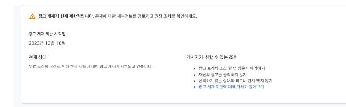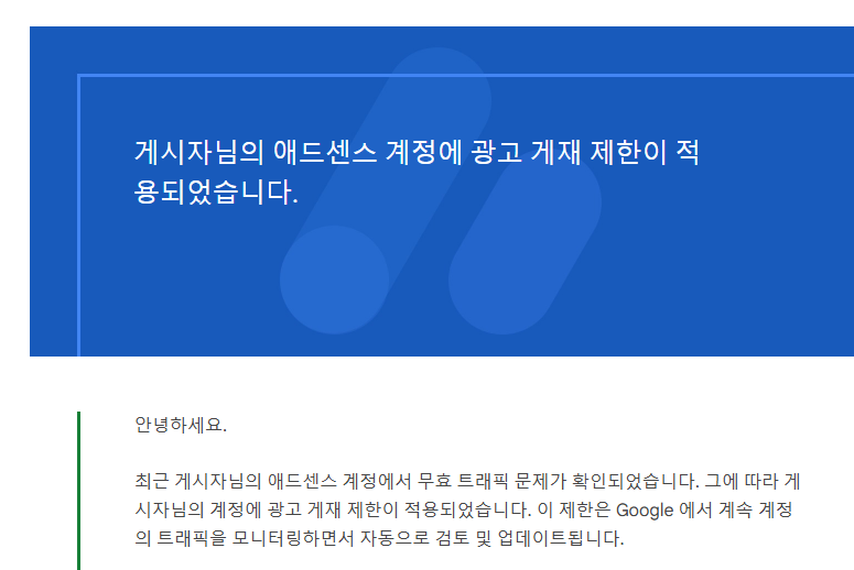 • 무효 트래픽 발생: 계정 주인 혹은 계정 주인과 같은 네트워크를 사용하는 누군가가 블로그 글을 읽고 광고를 클릭하는 행위등이 발생한 경우입니다.